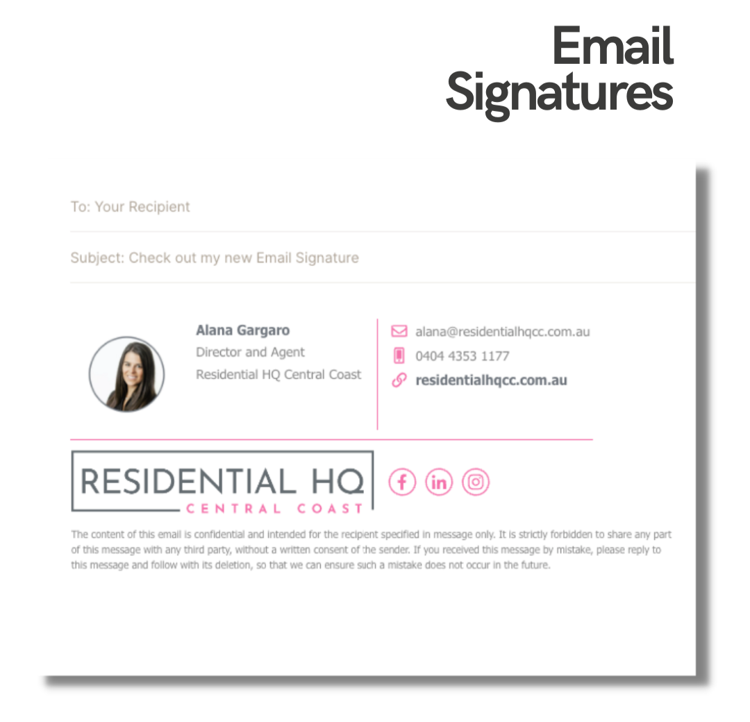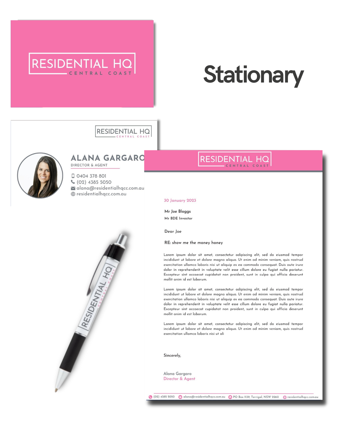 Residential HQ is a Central Coast–based real estate agency specialising in property management and residential sales. Having successfully traded for over a decade, the business was well established but ready for its next chapter. As a mobile agency without a traditional bricks-and-mortar office, Residential HQ needed a bold brand refresh that would stand out in a saturated real estate market and authentically reflect the energy, professionalism and personality of its director, Alana.